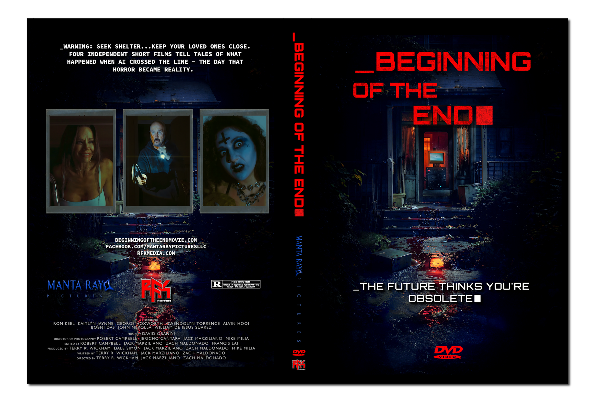 The authorized DVD release of BEGINNING OF THE END - four independent short films connected by the theme of A.I. turning humans against each other. The first film stars RFK Media artist Ron Keel, Playboy model Kaitlyn Jaynne, and actress Melody Portnoy. The item is autographed by Ron Keel.
